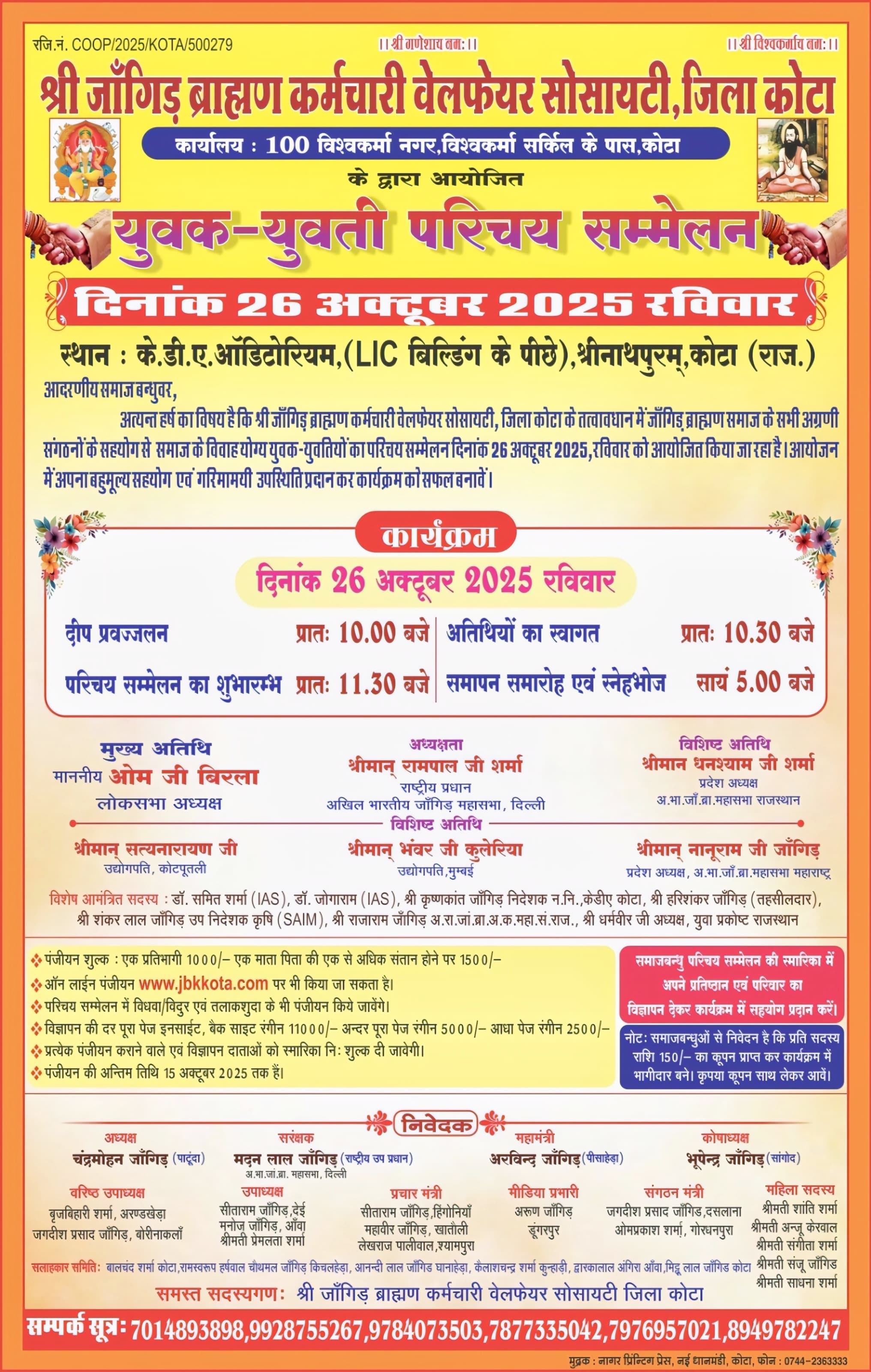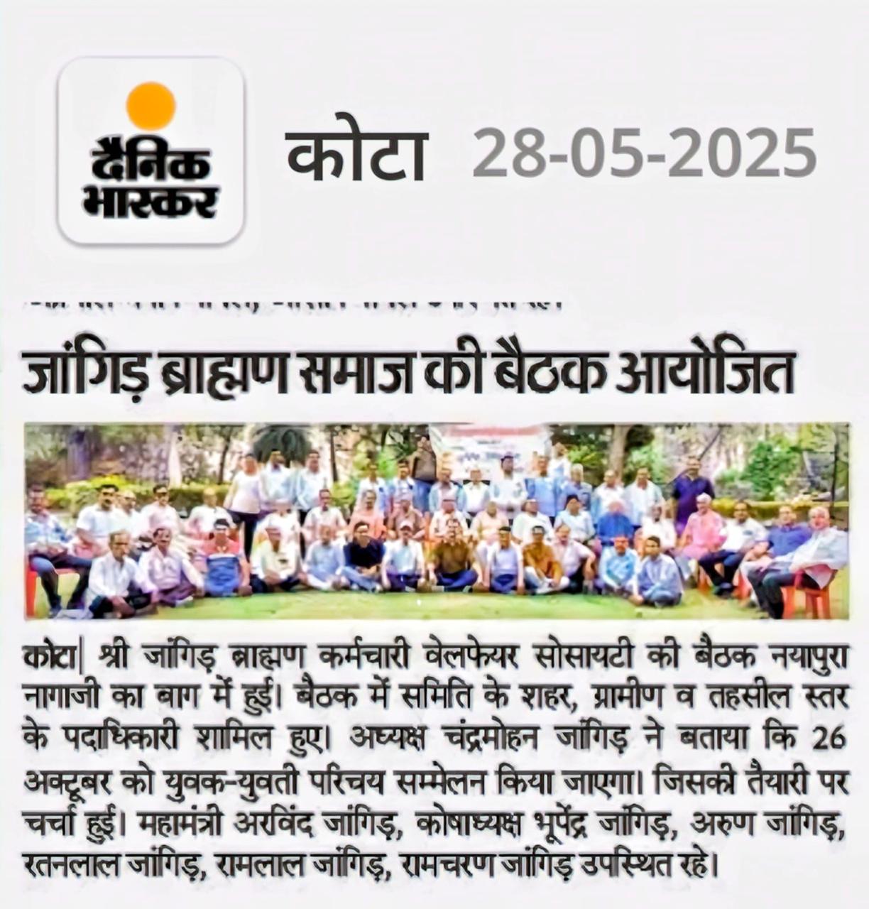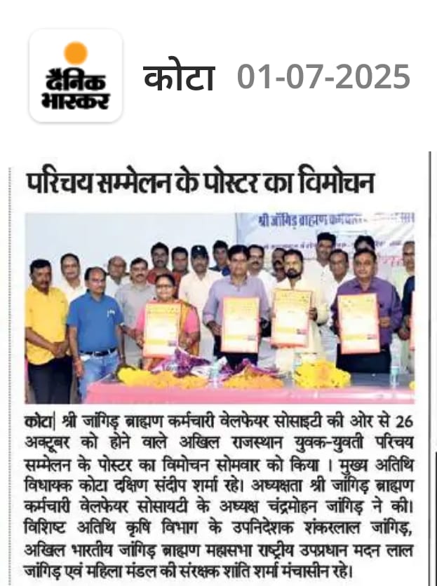 हमें यह बताते हुए अत्यंत हर्ष हो रहा है कि श्री जांगिड़ ब्राह्मण कर्मचारी वेलफेयर सोसाइटी, कोटा निरंतर समाजहित में कार्य कर रही है और समाज के संगठन, सहयोग एवं समग्र विकास की दिशा में महत्वपूर्ण कदम उठा रही है। हमारा उद्देश्य न केवल समाज के सदस्यों को एक मंच पर एकत्र करना है, बल्कि उनमें परस्पर सहयोग, सद्भावना और जागरूकता की भावना को भी सुदृढ़ करना है।